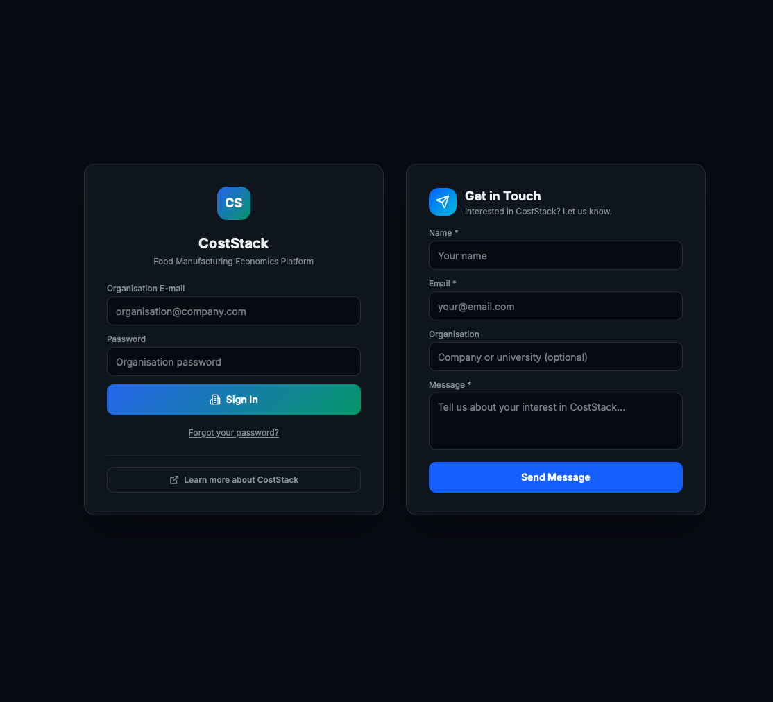 CostStack employs a dual-layer authentication model designed for enterprise-grade security. The first layer operates at the organisational level — each company receives a dedicated login environment, fully isolated from other organisations.