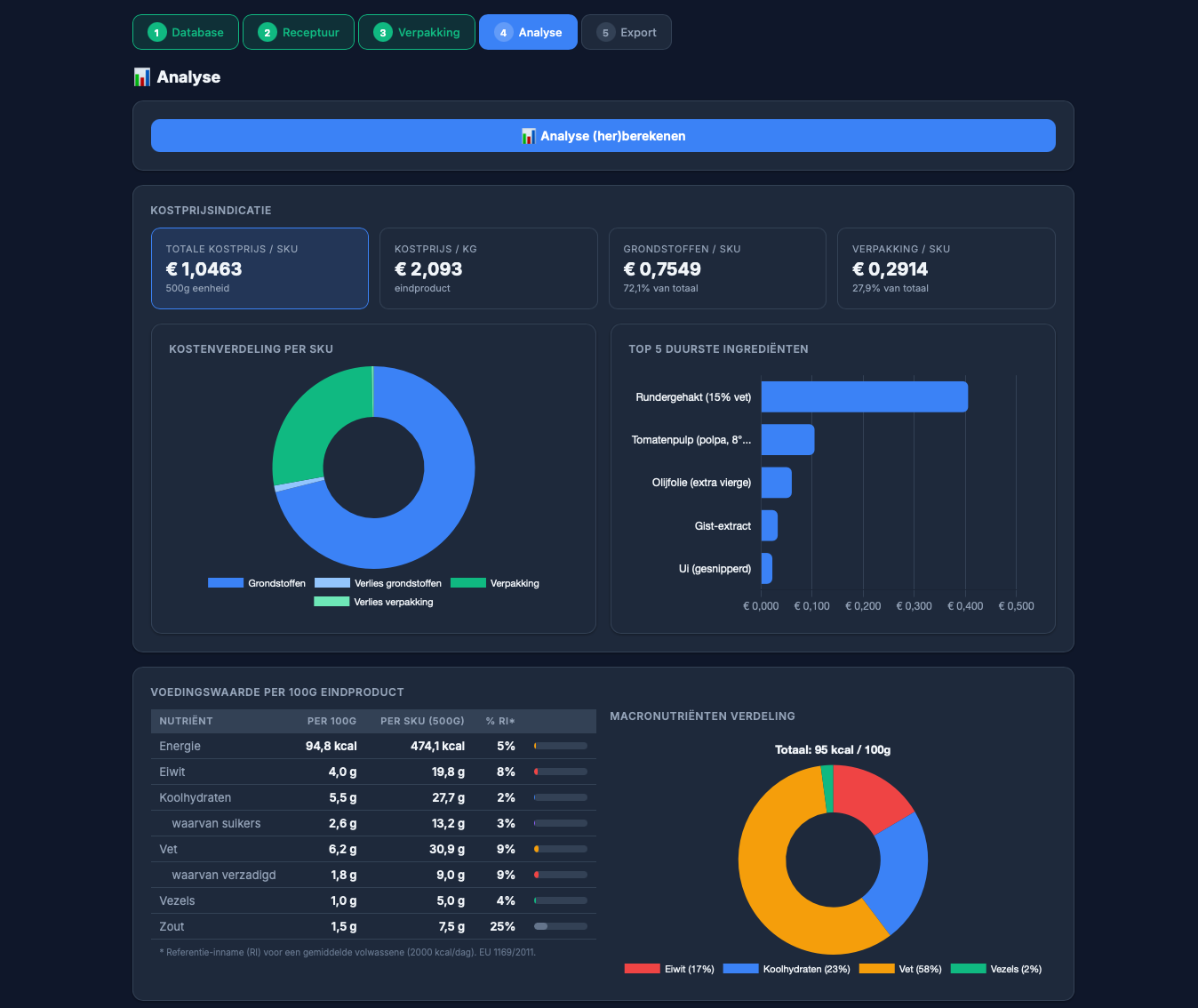 To calculate operating performance, users can either work with predefined raw material prices or import a detailed Bill of Materials (BoM), for example generated via RecipBite. This enables a fully integrated cost price calculation at product level.