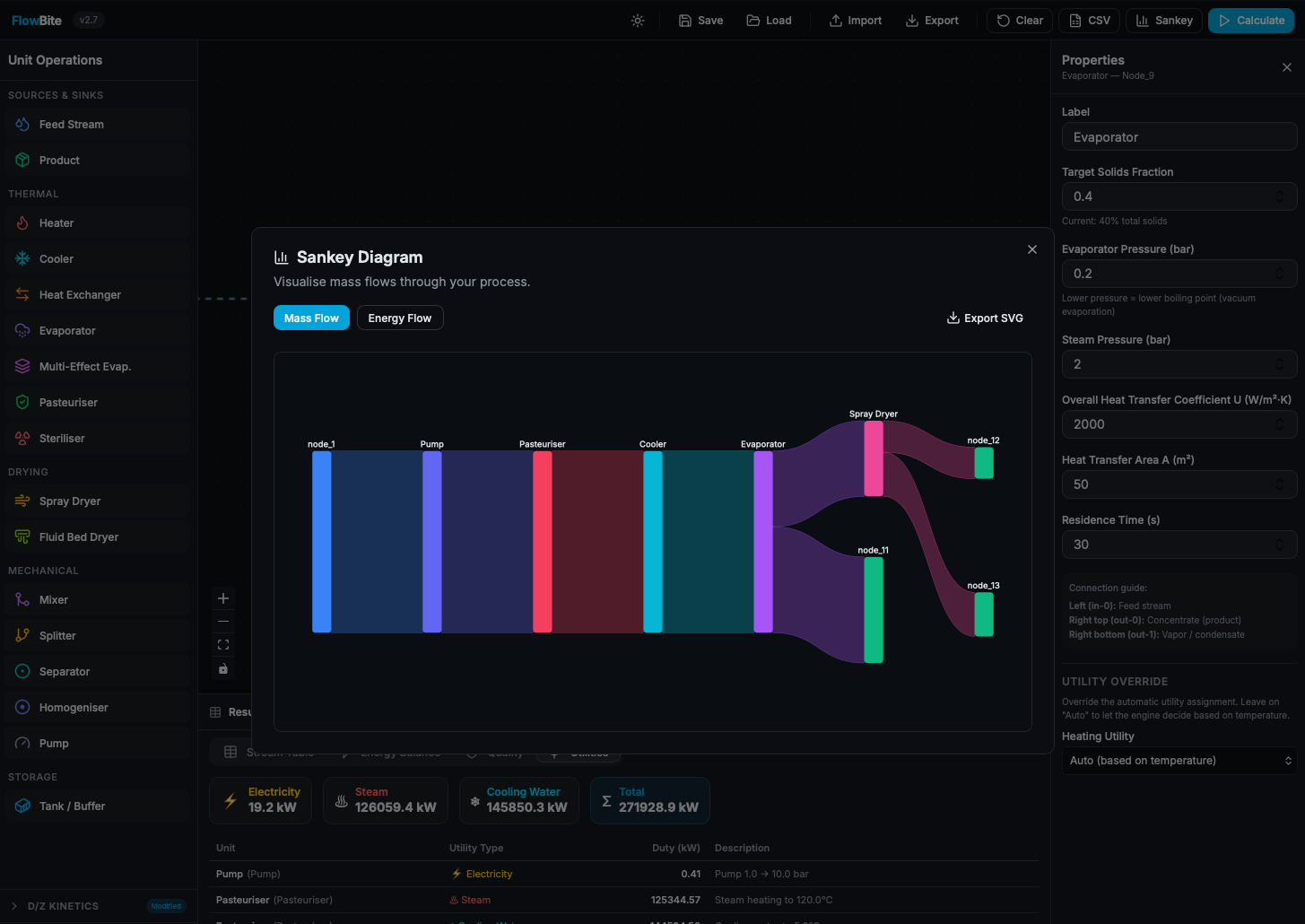 Flowbite is designed for process engineers who want to design quickly and with confidence. Using an intuitive drag-and-drop interface, you can build your own flowsheet in minutes — from simple mixing steps to complete thermal processes including evaporation, drying, or pasteurisation. Every unit operation includes built-in thermodynamic calculations, so you’re not just drawing a diagram — you’re generating a validated mass and energy balance.