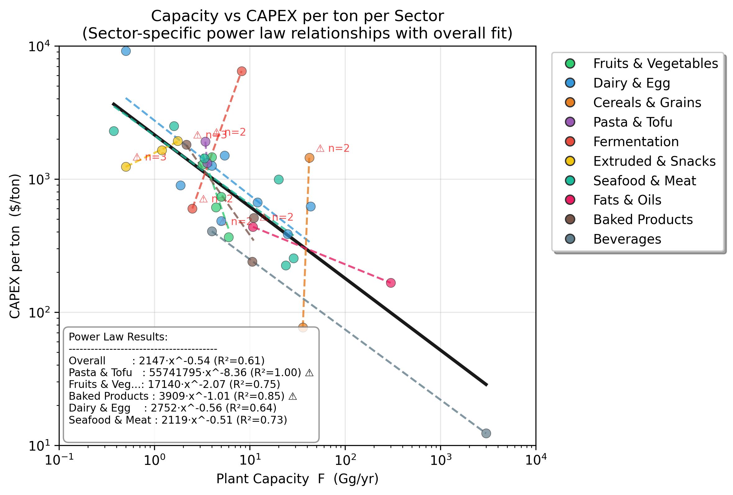 Although the general scaling pattern is consistent across the food industry, there are important differences between individual sectors. Some processes require far more specialized equipment than others and therefore show much higher capital intensity.