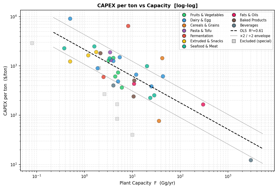 Despite the complexity of food manufacturing technology, the relationship between production capacity and capital investment follows a surprisingly consistent pattern. Larger plants almost always achieve lower capital costs per ton of production due to economies of scale.