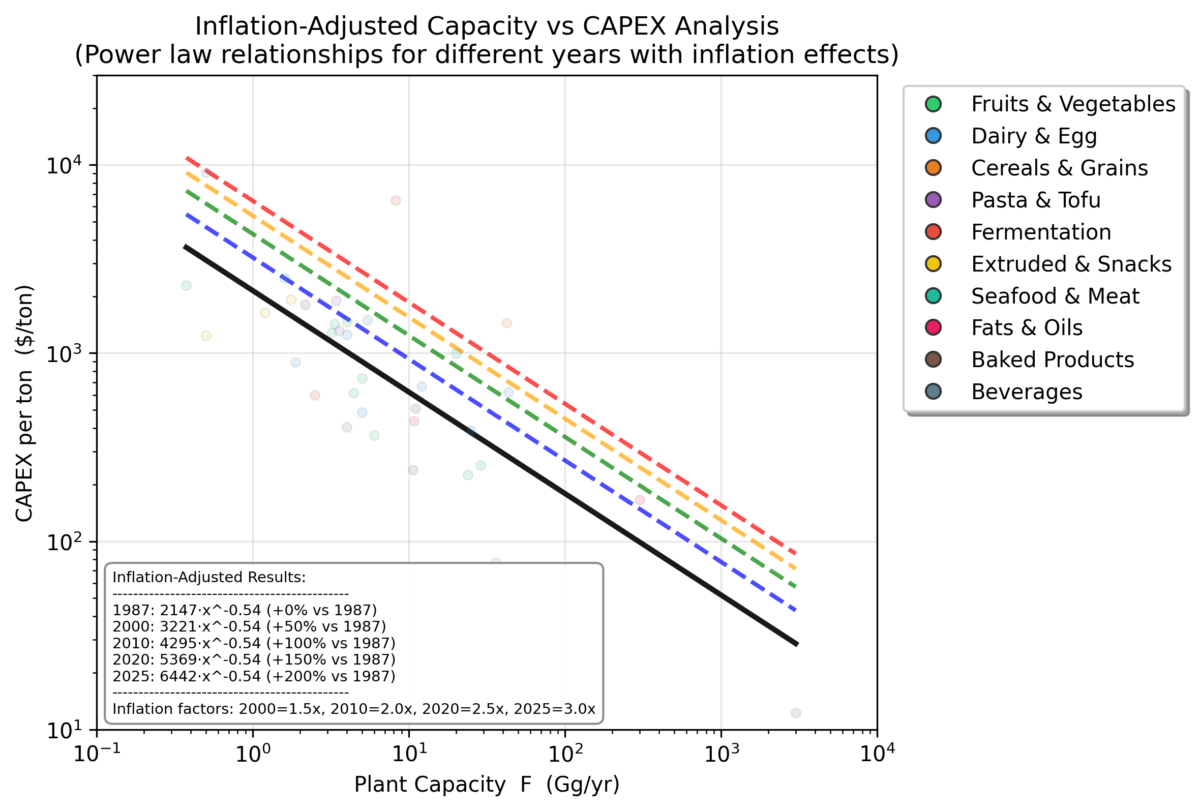 To illustrate this effect, the historical cost relationship has been adjusted using approximate inflation factors for several reference years. When this adjustment is applied, the overall shape of the cost curve remains almost identical, but the entire curve shifts upward. In other words, the fundamental relationship between plant size and investment remains stable, while the absolute cost level increases.