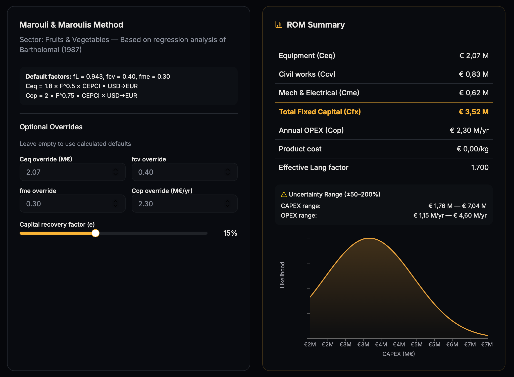 Although this method remains approximate, it is widely used during the earliest phases of project development because it allows a first estimate of total investment to be generated quickly.