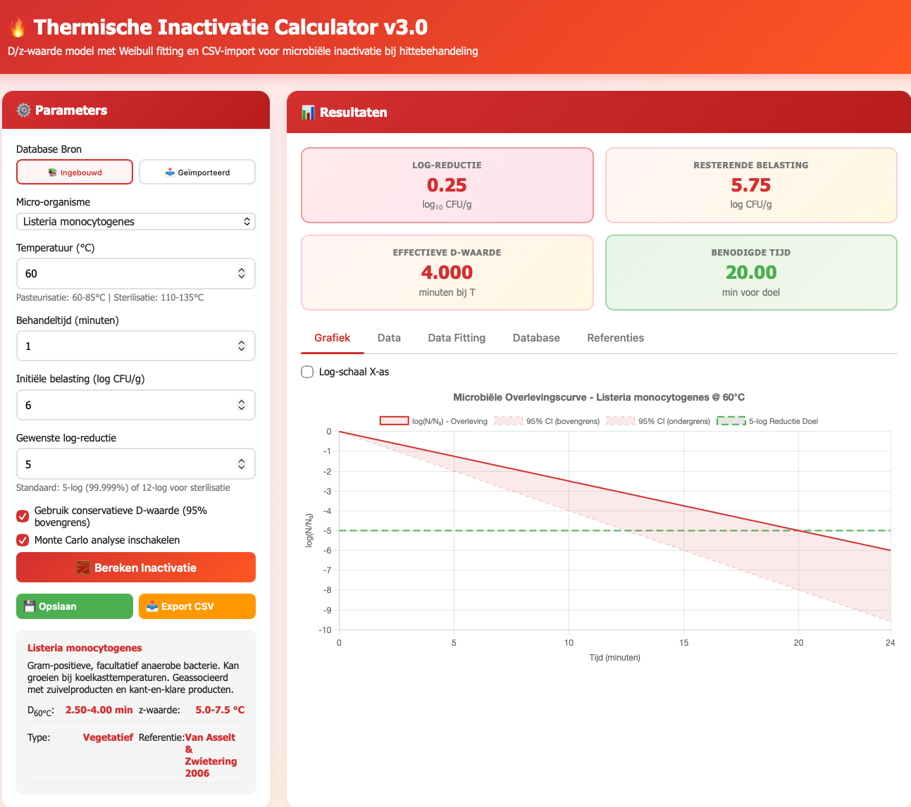 The Thermal Inactivation Calculator v3.0 streamlines this workflow entirely. It combines a powerful calculation engine with a curated database of D- and z-values for over 16 critical pathogens and spoilage organisms—all sourced from peer-reviewed literature.