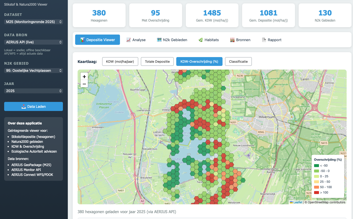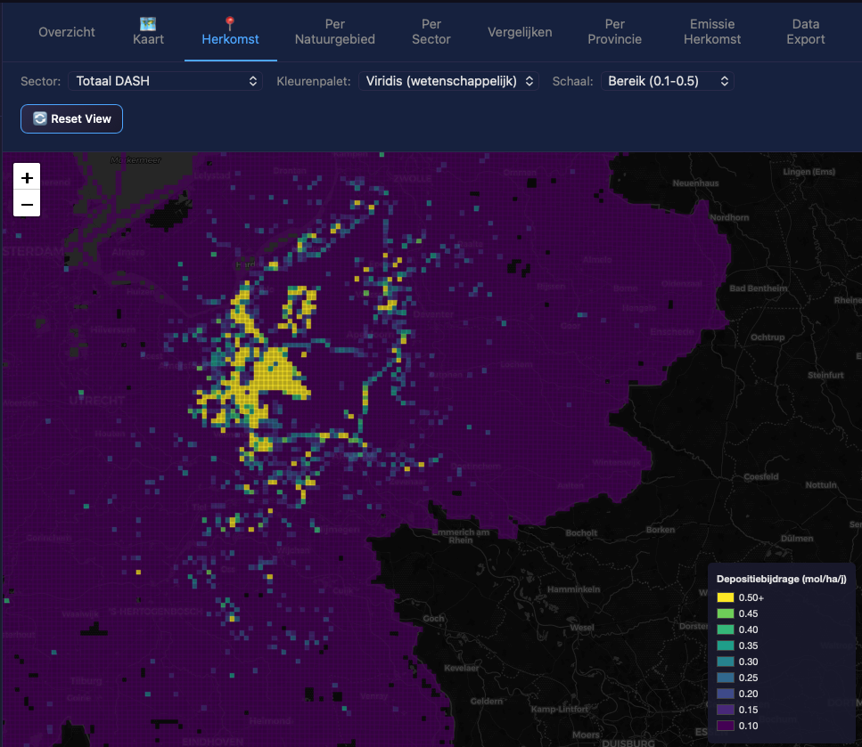 eports consolidate all statistics and visualizations into a print-ready format exportable as PDF. Data is sourced from AERIUS Connect via GeoJSON and WFS APIs, covering deposition grids, relevant habitats, and emission source breakdowns. The tool supports environmental assessments and nitrogen policy evaluation.