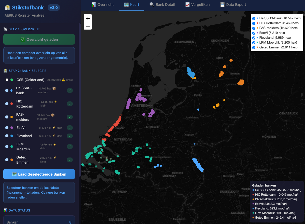 The Stikstofbank Viewer provides real-time insight into the reserved and available nitrogen space within the Dutch national and provincial nitrogen banks from AERIUS Register. Connecting directly to the official WFS open data API, it visualises all seven active nitrogen banks with interactive maps, utilisation gauges, and comparative analytics.
