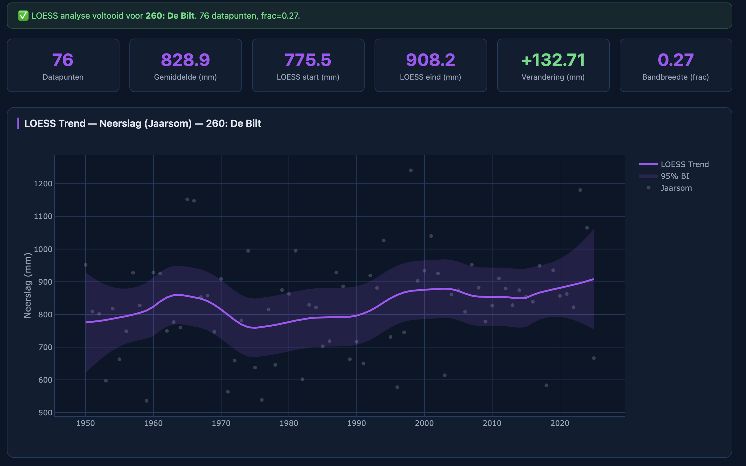 The application allows you to analyze trends in wet and dry periods over decades, providing crucial context for water management, agriculture, and infrastructure planning. With its intuitive interface and direct KNMI API integration, this tool makes complex hydrological analysis accessible to everyone, helping you anticipate and respond to future water challenges.