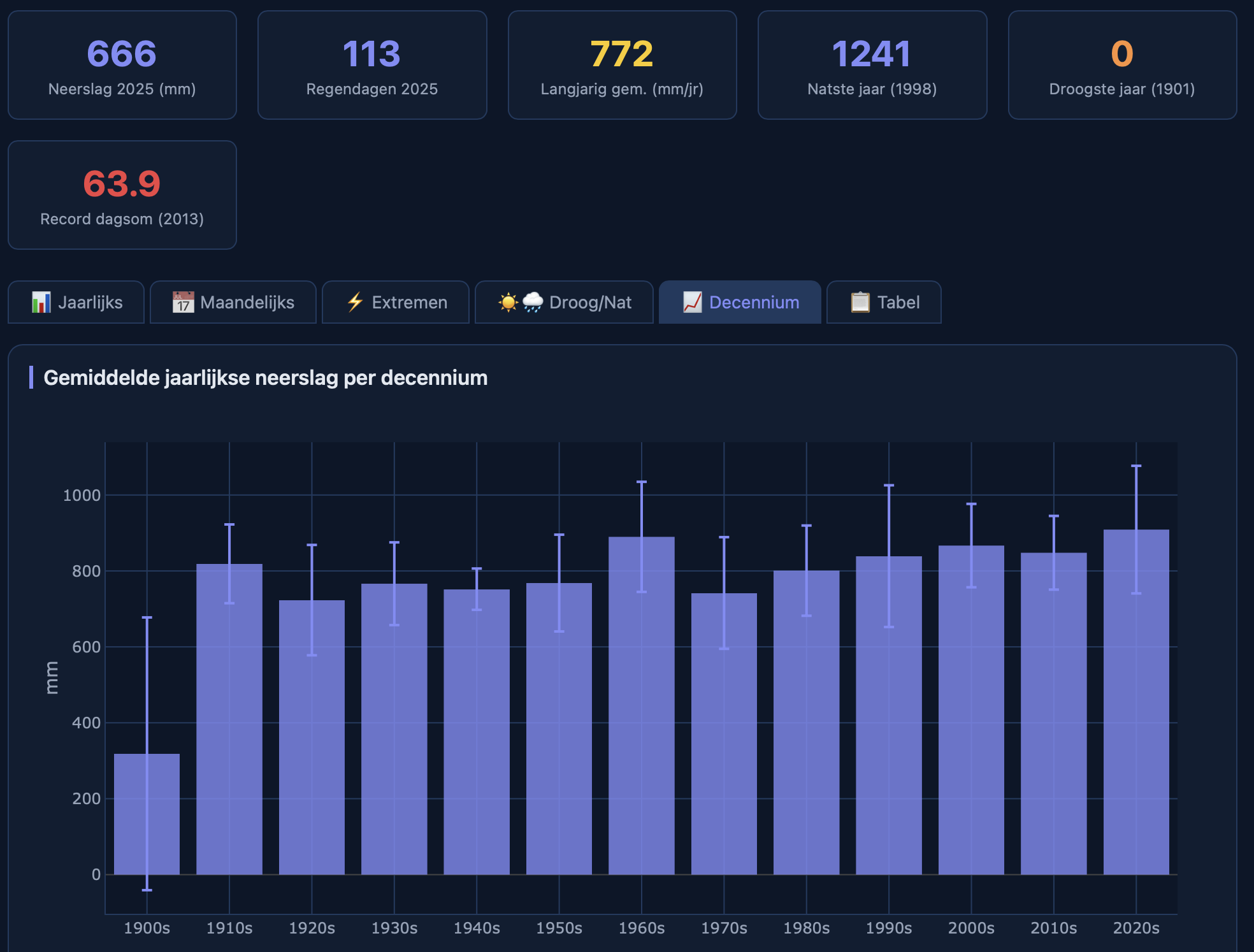 From prolonged droughts to extreme downpours, precipitation patterns are becoming increasingly critical. The Precipitation Analysis tool offers a deep dive into Dutch rainfall history. Track annual and monthly precipitation totals, count the number of rain days, and identify the frequency of extreme precipitation events.