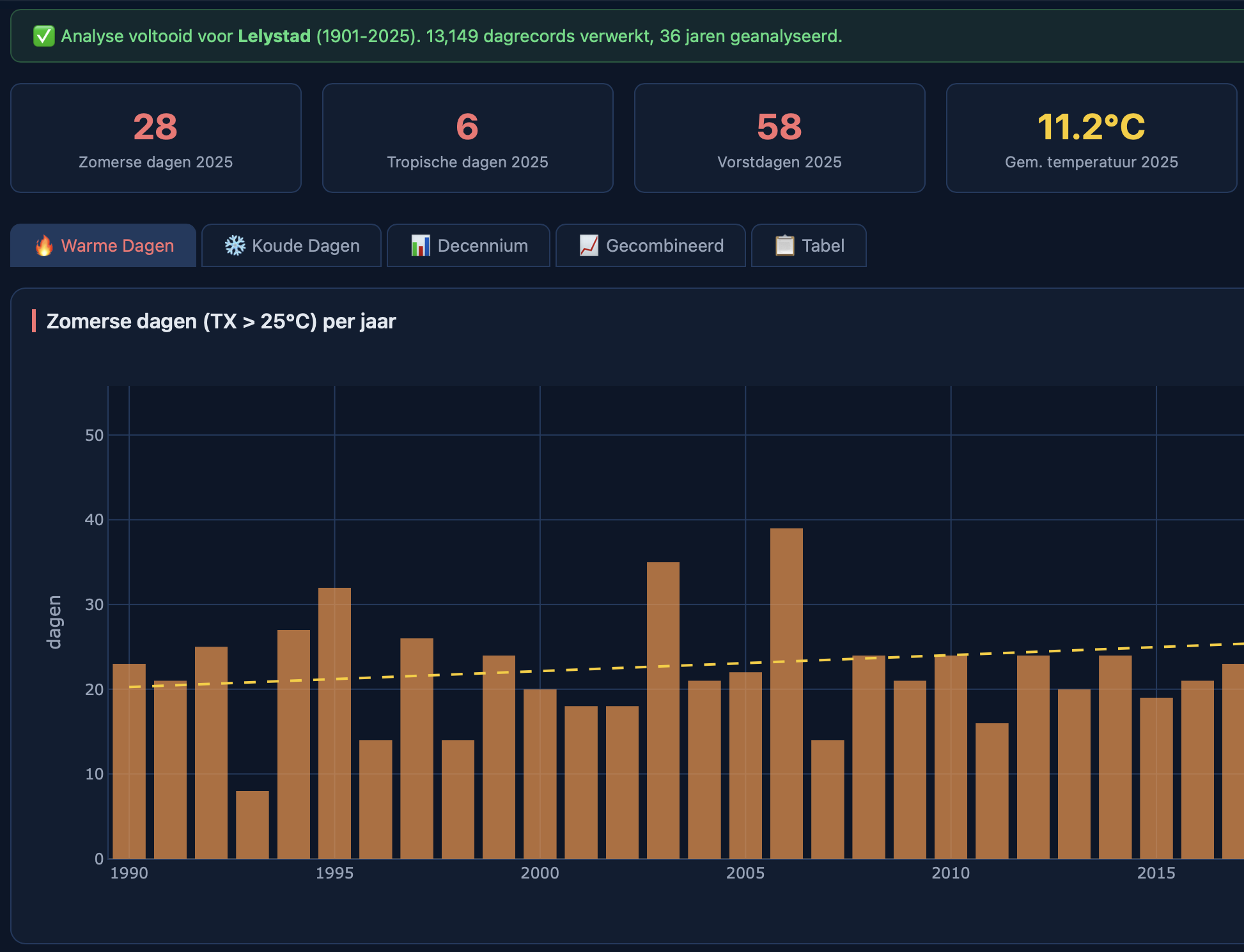 Go beyond daily forecasts and dive into over a century of climate data. The Temperature Analysis tool transforms raw daily measurements from the KNMI into powerful, long-term insights. Effortlessly track the frequency of heatwaves, tropical days, and frost periods, or visualize how average temperatures have evolved decade by decade.