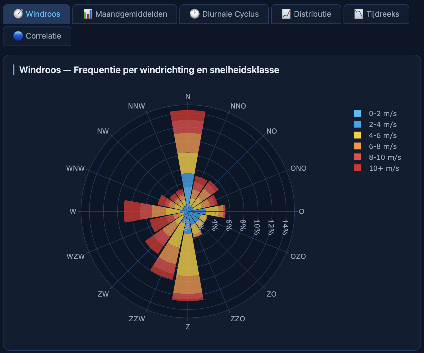 Wind is a defining feature of the Dutch climate, and this tool lets you explore its every nuance. The Wind Analysis application provides a comprehensive suite of visualizations, from the classic wind rose showing dominant directions to detailed monthly and diurnal cycle charts.