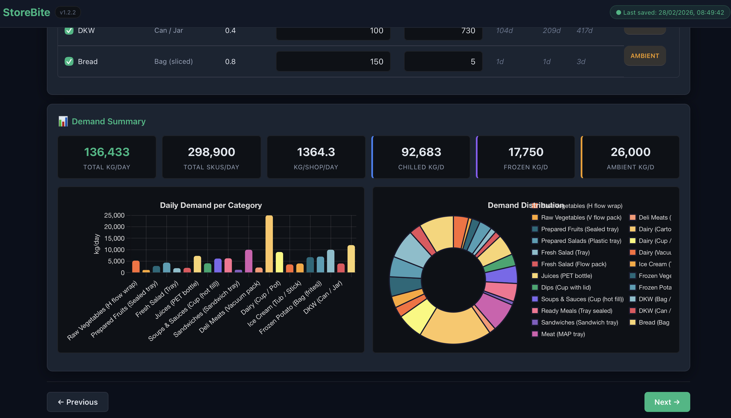 Stop guessing what your factory needs to produce. StoreBite connects the retail shelf directly to your production line, eliminating the chaos of disconnected spreadsheets. By modeling your entire retail network—from store counts and delivery frequencies to crate fills and trolley stacks—StoreBite calculates exactly what needs to move, when, and how.
