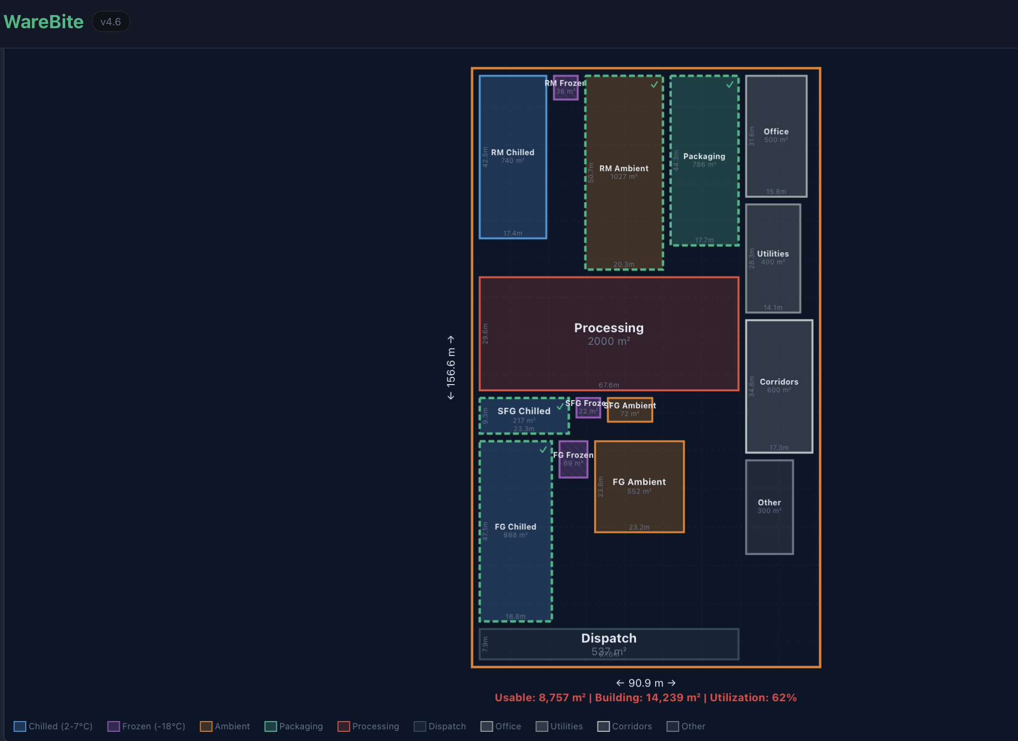 Designing a food factory warehouse is a complex balancing act between storage capacity, footprint, and cost. WareBite turns this challenge into a streamlined, visual process. It dimensions every square meter of your facility—from the freezing cold of the deep-freeze zone to the high-traffic loading dock—based on real inventory data, not rules of thumb.