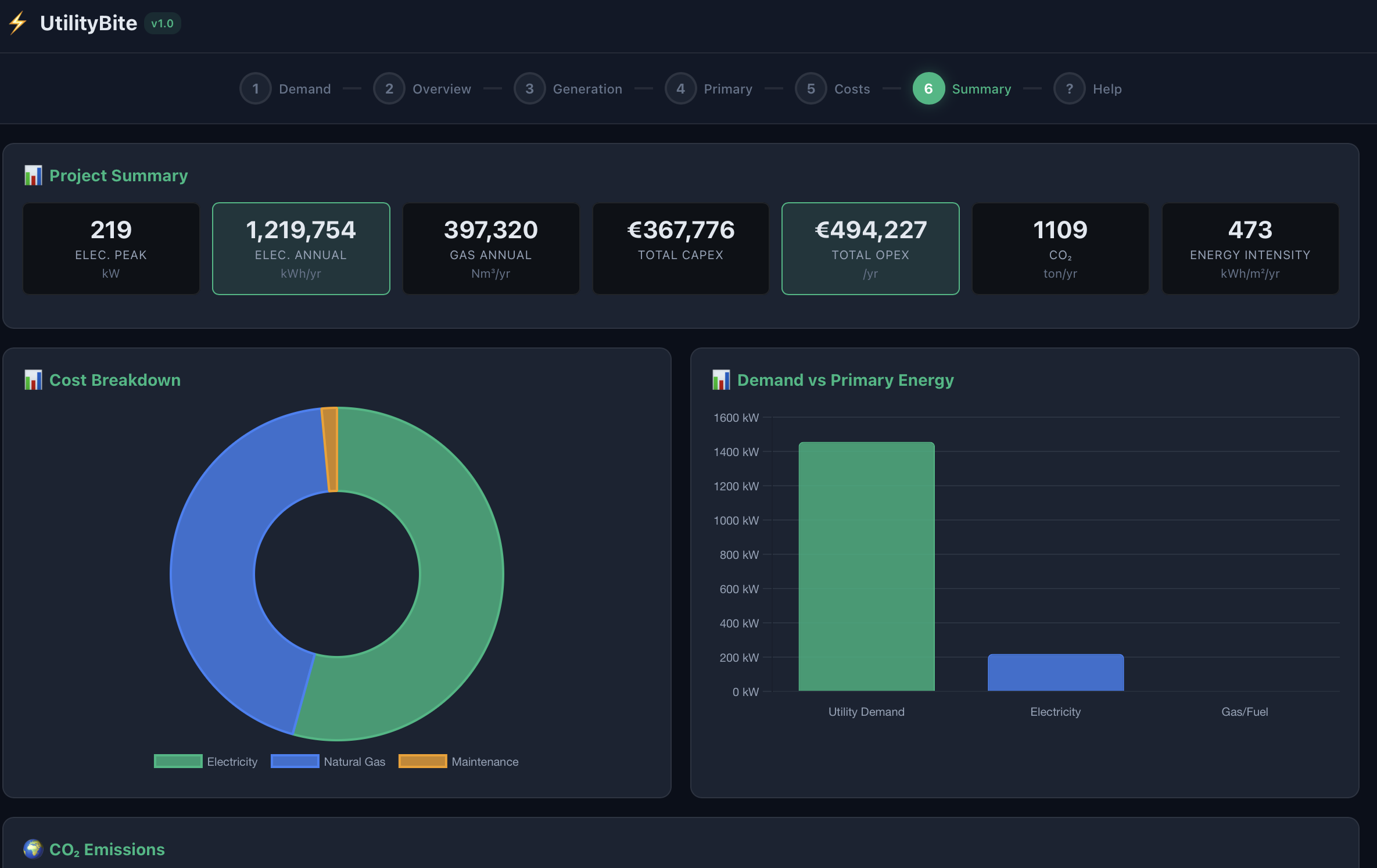 No more waiting for external consultants to estimate your utility bill. UtilityBite gives you a detailed breakdown of cooling, steam, compressed air, and hot water demands in minutes. It translates engineering units into business metrics, providing clear CAPEX, OPEX, and CO₂ emission forecasts. Whether you are sizing a new boiler or calculating the ROI of a heat pump, UtilityBite ensures your sustainability goals are backed by solid engineering data. Know your footprint before you build.
